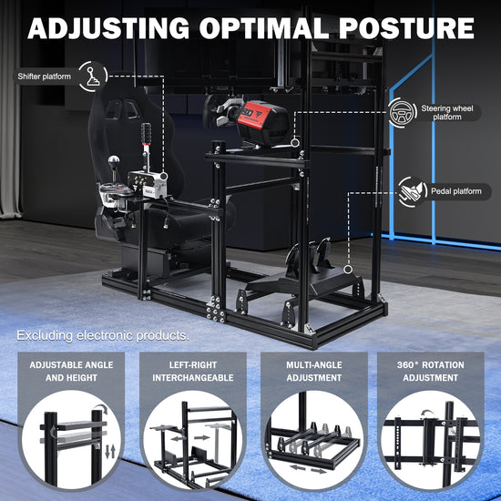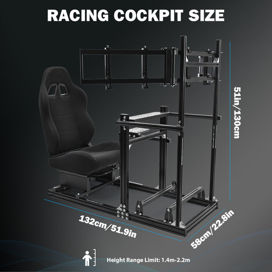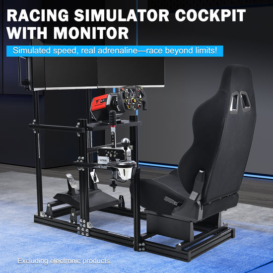 【Monitor Mount】Accommodates three identical 27-inch or 32-inch monitors with a combined weight capacity of 120 lbs, delivering an expansive immersive viewing experience. Does not include steering wheel, pedals, handbrake,or monitors