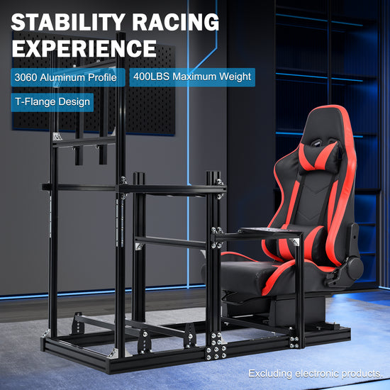 【Stable Structure】Racing stand is constructed from heavy-duty 3060 and 3030 aluminum profiles compliant with European standards.the overall structure is stable and can withstand the impact of intense driving