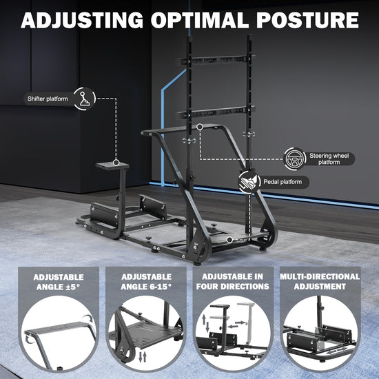 【Fully Adjustable】This racing simulator cockpit fits all racer types, with adjustable pedal & platform angles, left/right shifter mounting, and customizable seat mount height & distance