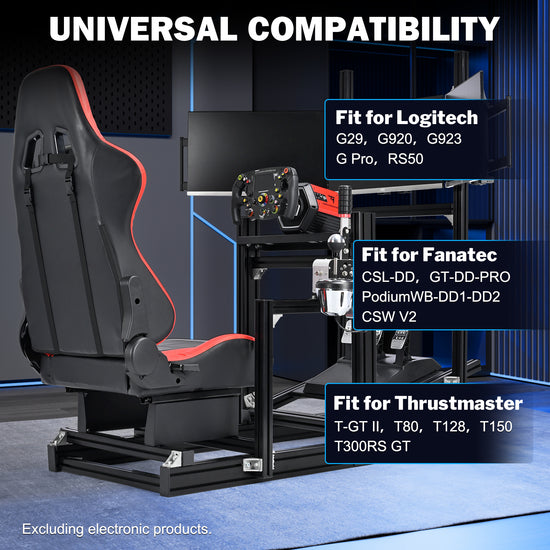 【Wide Device Compatibility】 Designed to accommodate a broad range of popular sim racing gear, this cockpit is compatible with major brands including Logitech (G29, G920, G923, Pro), Thrustmaster (T500, T818, T80, T128, T300), Fanatec (CSL-DD, GT-DD-PRO), Moza (R5, R9, R12, R16), and PXN V9